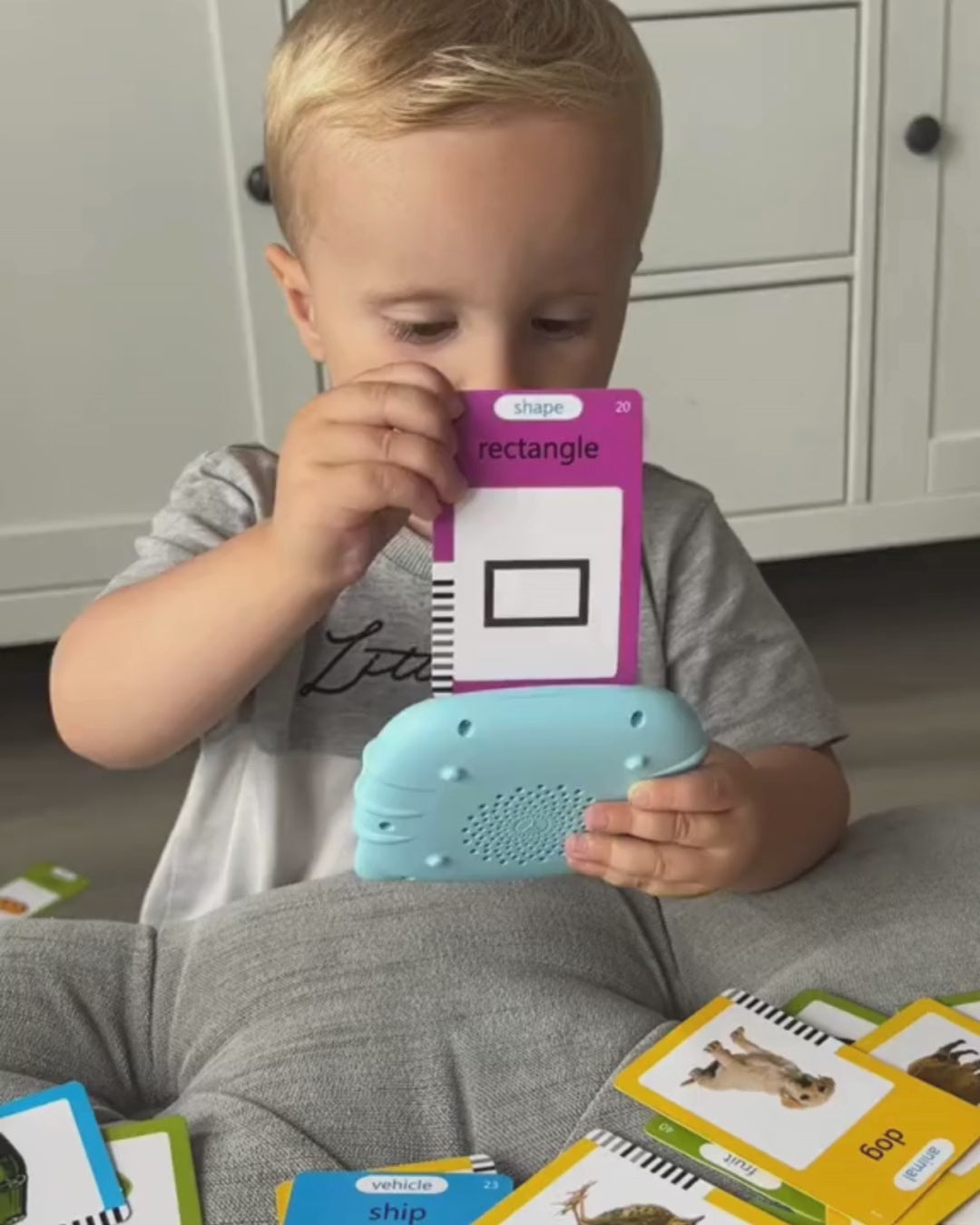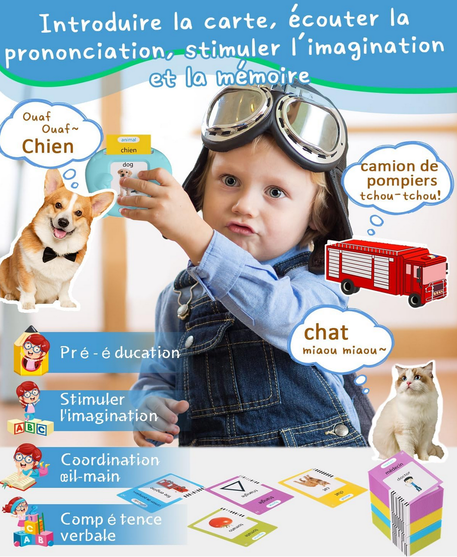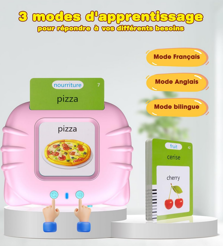 Apprentissage fun des langues: insère la carte, écoute, progresse. Français, anglais ou bilingue. Un geste, un mot, un déclic.